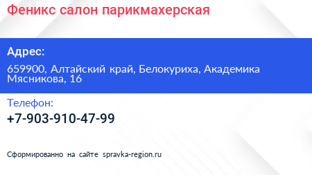 Феникс, салон-парикмахерская по адресу 659900, Алтайский край, Белокуриха, Академика Мясникова, 16 в дальнейшем Организация, размещена в следующих категориях:
