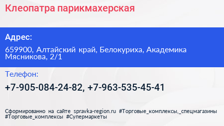 Клеопатра, парикмахерская по адресу 659900, Алтайский край, Белокуриха, Академика Мясникова, 2/1 в дальнейшем Организация, размещена в следующих категориях: