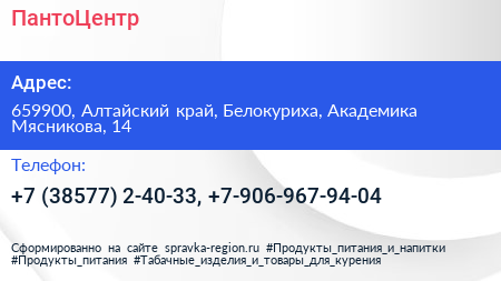 ПантоЦентр по адресу 659900, Алтайский край, Белокуриха, Академика Мясникова, 14 в дальнейшем Организация, размещена в следующих категориях: