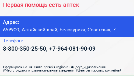 Первая помощь, сеть аптек по адресу 659900, Алтайский край, Белокуриха, Советская, 7 в дальнейшем Организация, размещена в следующих категориях: