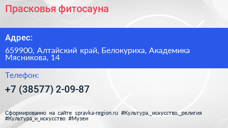 Прасковья, фитосауна по адресу 659900, Алтайский край, Белокуриха, Академика Мясникова, 14 в дальнейшем Организация, размещена в следующих категориях: