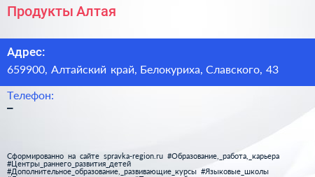 Продукты Алтая по адресу 659900, Алтайский край, Белокуриха, Славского, 43 в дальнейшем Организация, размещена в следующих категориях: