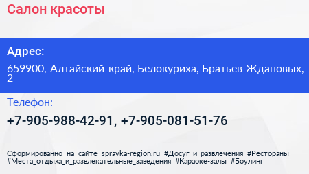 Салон красоты по адресу 659900, Алтайский край, Белокуриха, Братьев Ждановых, 2 в дальнейшем Организация, размещена в следующих категориях: