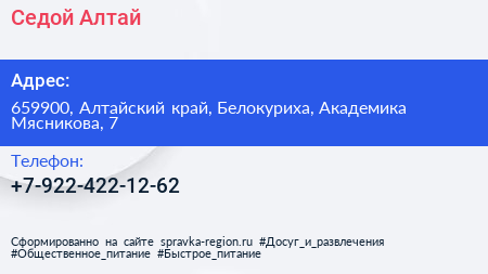 Седой Алтай по адресу 659900, Алтайский край, Белокуриха, Академика Мясникова, 7 в дальнейшем Организация, размещена в следующих категориях: