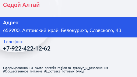 Седой Алтай по адресу 659900, Алтайский край, Белокуриха, Славского, 43 в дальнейшем Организация, размещена в следующих категориях: