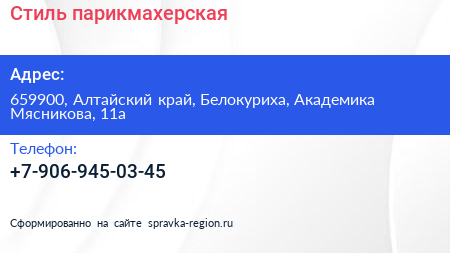Стиль, парикмахерская по адресу 659900, Алтайский край, Белокуриха, Академика Мясникова, 11а в дальнейшем Организация, размещена в следующих категориях: