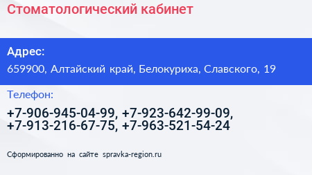 Стоматологический кабинет по адресу 659900, Алтайский край, Белокуриха, Славского, 19 в дальнейшем Организация, размещена в следующих категориях:
