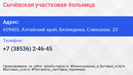 Сычёвская участковая больница по адресу 659603, Алтайский край, Белокуриха, Совхозная, 23 в дальнейшем Организация, размещена в следующих категориях: