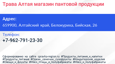 Трава Алтая, магазин пантовой продукции по адресу 659900, Алтайский край, Белокуриха, Бийская, 26 в дальнейшем Организация, размещена в следующих категориях:
