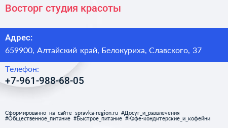 Восторг, студия красоты по адресу 659900, Алтайский край, Белокуриха, Славского, 37 в дальнейшем Организация, размещена в следующих категориях:
