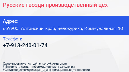 Русские гвозди, производственный цех по адресу 659900, Алтайский край, Белокуриха, Коммунальная, 10 в дальнейшем Организация, размещена в следующих категориях: