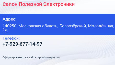 Салон Полезной Электроники по адресу 140250, Московская область, Белоозёрский, Молодёжная, 1д в дальнейшем Организация, размещена в следующих категориях: