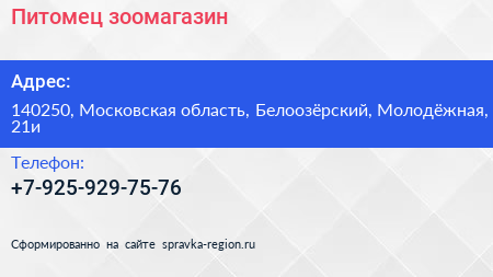 Питомец, зоомагазин по адресу 140250, Московская область, Белоозёрский, Молодёжная, 21и в дальнейшем Организация, размещена в следующих категориях: