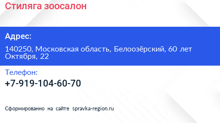 Стиляга, зоосалон по адресу 140250, Московская область, Белоозёрский, 60 лет Октября, 22 в дальнейшем Организация, размещена в следующих категориях: