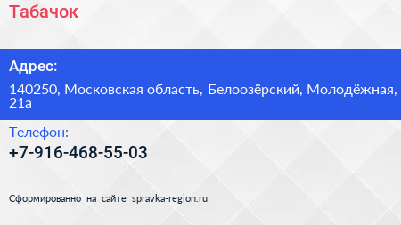 Табачок по адресу 140250, Московская область, Белоозёрский, Молодёжная, 21а в дальнейшем Организация, размещена в следующих категориях: