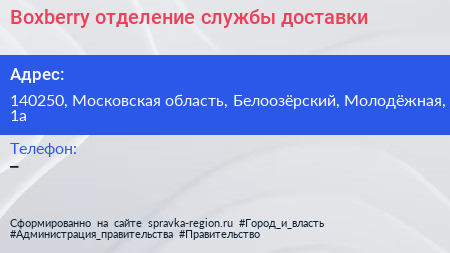 Boxberry, отделение службы доставки по адресу 140250, Московская область, Белоозёрский, Молодёжная, 1а в дальнейшем Организация, размещена в следующих категориях: