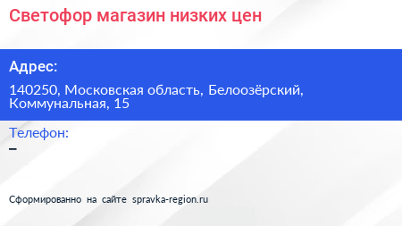 Светофор, магазин низких цен по адресу 140250, Московская область, Белоозёрский, Коммунальная, 15 в дальнейшем Организация, размещена в следующих категориях: