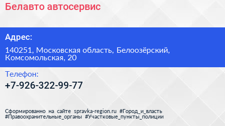 Белавто, автосервис по адресу 140251, Московская область, Белоозёрский, Комсомольская, 20 в дальнейшем Организация, размещена в следующих категориях: