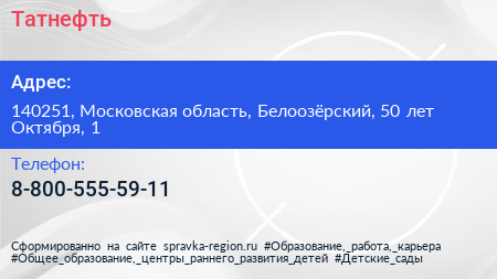 Татнефть по адресу 140251, Московская область, Белоозёрский, 50 лет Октября, 1 в дальнейшем Организация, размещена в следующих категориях: