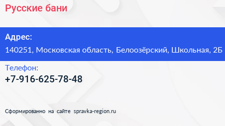 Русские бани по адресу 140251, Московская область, Белоозёрский, Школьная, 2Б в дальнейшем Организация, размещена в следующих категориях: