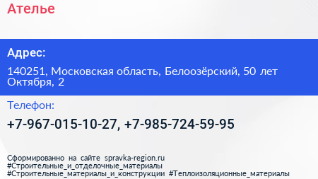 Ателье по адресу 140251, Московская область, Белоозёрский, 50 лет Октября, 2 в дальнейшем Организация, размещена в следующих категориях: