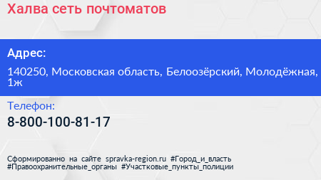 Халва, сеть почтоматов по адресу 140250, Московская область, Белоозёрский, Молодёжная, 1ж в дальнейшем Организация, размещена в следующих категориях: