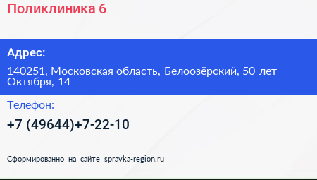 Поликлиника №6 по адресу 140251, Московская область, Белоозёрский, 50 лет Октября, 14 в дальнейшем Организация, размещена в следующих категориях: