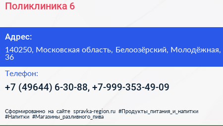 Поликлиника №6 по адресу 140250, Московская область, Белоозёрский, Молодёжная, 36 в дальнейшем Организация, размещена в следующих категориях: