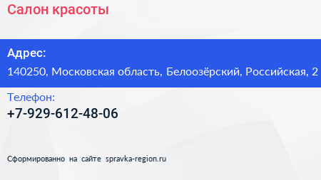 Салон красоты по адресу 140250, Московская область, Белоозёрский, Российская, 2 в дальнейшем Организация, размещена в следующих категориях: