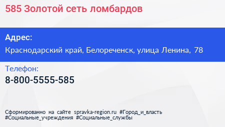 585*Золотой, сеть ломбардов по адресу Краснодарский край, Белореченск, улица Ленина, 78 в дальнейшем Организация, размещена в следующих категориях: