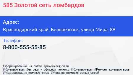585*Золотой, сеть ломбардов по адресу Краснодарский край, Белореченск, улица Мира, 89 в дальнейшем Организация, размещена в следующих категориях: