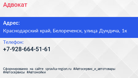 Адвокат по адресу Краснодарский край, Белореченск, улица Дундича, 1к в дальнейшем Организация, размещена в следующих категориях: