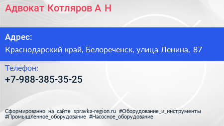 Адвокат Котляров А.Н. по адресу Краснодарский край, Белореченск, улица Ленина, 87 в дальнейшем Организация, размещена в следующих категориях: