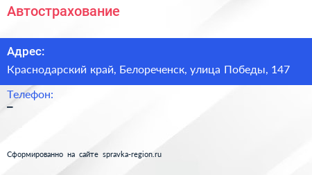 Автострахование по адресу Краснодарский край, Белореченск, улица Победы, 147 в дальнейшем Организация, размещена в следующих категориях: