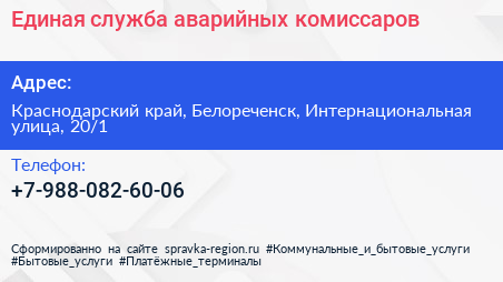 Единая служба аварийных комиссаров по адресу Краснодарский край, Белореченск, Интернациональная улица, 20/1 в дальнейшем Организация, размещена в следующих категориях: