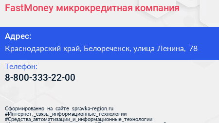 FastMoney, микрокредитная компания по адресу Краснодарский край, Белореченск, улица Ленина, 78 в дальнейшем Организация, размещена в следующих категориях: