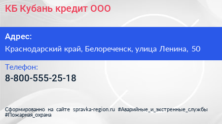 КБ Кубань кредит, ООО по адресу Краснодарский край, Белореченск, улица Ленина, 50 в дальнейшем Организация, размещена в следующих категориях: