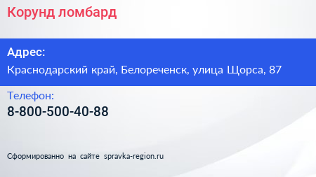 Корунд, ломбард по адресу Краснодарский край, Белореченск, улица Щорса, 87 в дальнейшем Организация, размещена в следующих категориях:
