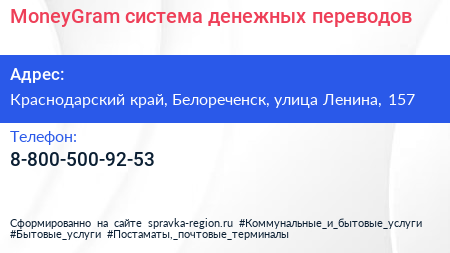 MoneyGram, система денежных переводов по адресу Краснодарский край, Белореченск, улица Ленина, 157 в дальнейшем Организация, размещена в следующих категориях: