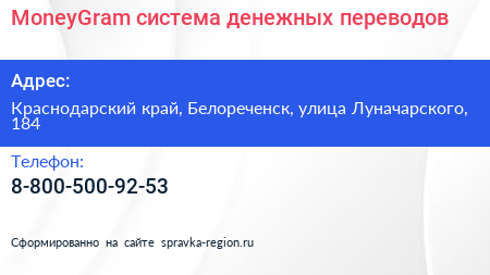 MoneyGram, система денежных переводов по адресу Краснодарский край, Белореченск, улица Луначарского, 184 в дальнейшем Организация, размещена в следующих категориях: