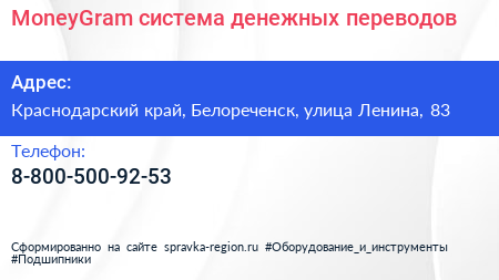 MoneyGram, система денежных переводов по адресу Краснодарский край, Белореченск, улица Ленина, 83 в дальнейшем Организация, размещена в следующих категориях: