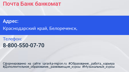 Почта Банк, банкомат по адресу Краснодарский край, Белореченск, в дальнейшем Организация, размещена в следующих категориях: