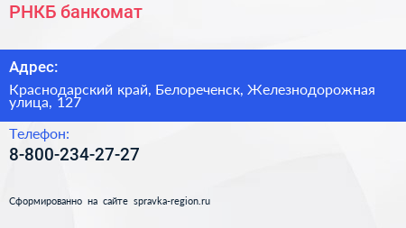 РНКБ, банкомат по адресу Краснодарский край, Белореченск, Железнодорожная улица, 127 в дальнейшем Организация, размещена в следующих категориях: