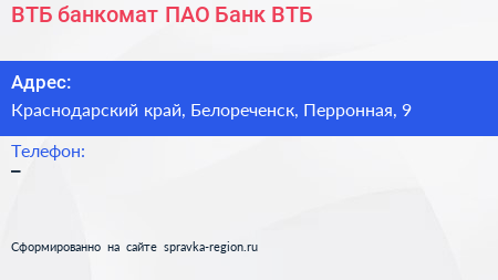 ВТБ, банкомат, ПАО Банк ВТБ по адресу Краснодарский край, Белореченск, Перронная, 9 в дальнейшем Организация, размещена в следующих категориях: