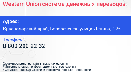 Western Union, система денежных переводов по адресу Краснодарский край, Белореченск, улица Ленина, 125 в дальнейшем Организация, размещена в следующих категориях: