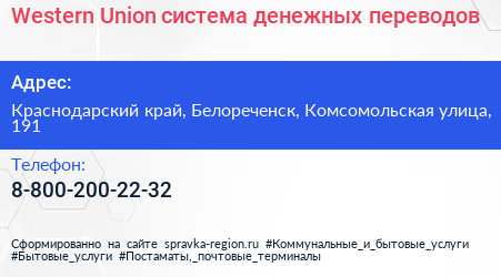 Western Union, система денежных переводов по адресу Краснодарский край, Белореченск, Комсомольская улица, 191 в дальнейшем Организация, размещена в следующих категориях: