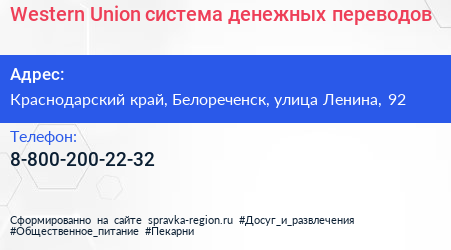Western Union, система денежных переводов по адресу Краснодарский край, Белореченск, улица Ленина, 92 в дальнейшем Организация, размещена в следующих категориях: