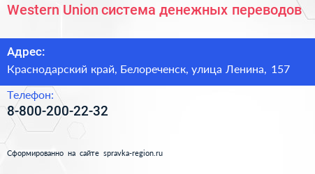 Western Union, система денежных переводов по адресу Краснодарский край, Белореченск, улица Ленина, 157 в дальнейшем Организация, размещена в следующих категориях: