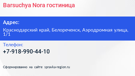 Barsuchya Nora, гостиница по адресу Краснодарский край, Белореченск, Аэродромная улица, 1/1 в дальнейшем Организация, размещена в следующих категориях: