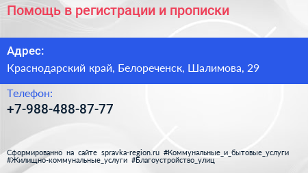 Помощь в регистрации и прописки по адресу Краснодарский край, Белореченск, Шалимова, 29 в дальнейшем Организация, размещена в следующих категориях: